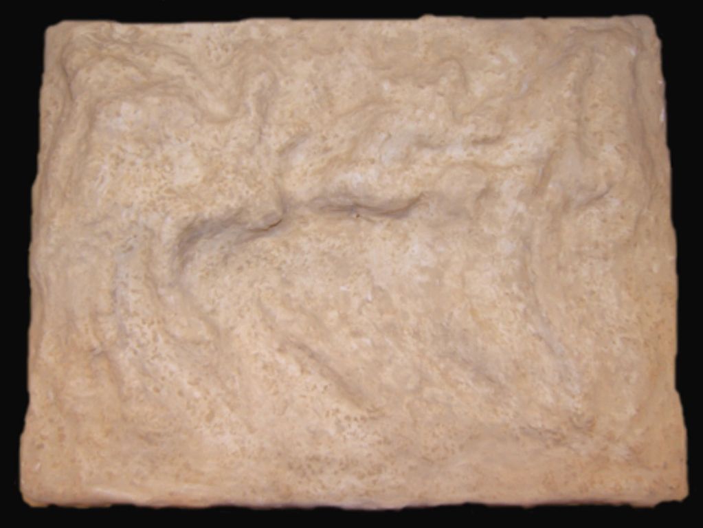 The surface is paper pulp and glue which has been molded into a rock-like form. The combination of pulp and glue is derived from the Ancient Egyptian process of making cartonage which can be sculpted and molded like clay.